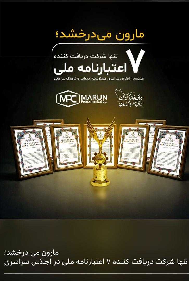 در هشتمین اجلاس سراسری مسئولیت اجتماعی، از پتروشیمی مارون بهعنوان تنها شرکتی که موفق به دریافت تمامی هفت اعتبارنامه ملی در محورهای مختلفی از جمله محیط زیست، خدمات درمانی، امنیت غذایی و فرهنگ شد، تقدیر به عمل آمد و تندیس زرین این رویداد را دریافت کرد. این موفقیت، تعهد راهبردی این شرکت به مسئولیتپذیری اجتماعی و توسعه پایدار را نشان میدهد.